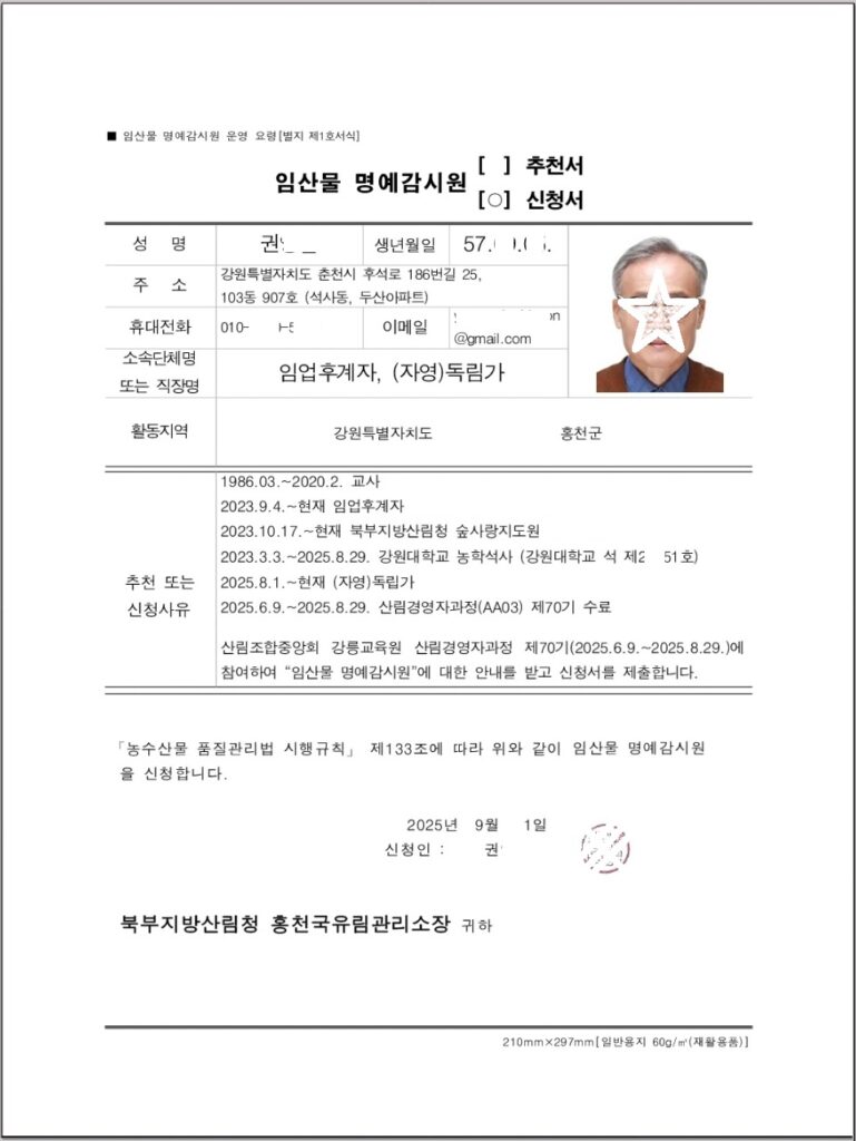 2026년 2월10일 나는 이 글의 끝부분을 다시 고쳐쓰고 있다. 어제 북부지방산림청 담당자로부터 임산물명예감시원을 모집한다는 연락을 받았다. 오늘 신청서를 메일로 보냈다.