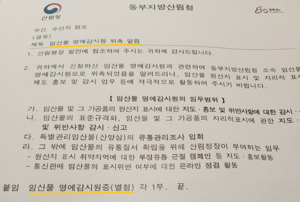 산림경영자과정에 함께 참여한 강릉 거주 동기는 동부지방산림청에 신청하여 임산물 명예감시원에 위촉되어 임산물 명예감시원증을 받았다.